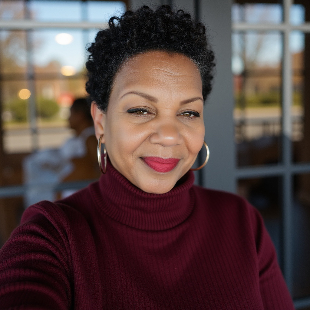 A woman with short, curly black hair, wearing a maroon turtleneck sweater and hoop earrings, smiling at the camera inside a building with large windows.
